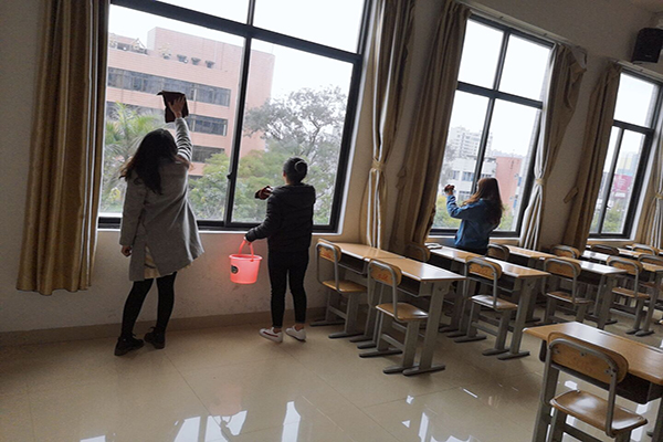 本次活动,2018级汉语言文学5班全班30名同学分为10个小分队,对西校区格致楼部分教室进行桌椅卫生清洁,给校园路标指示牌“洗脸”,清除校园公共宣传栏过期广告等等,整个志愿活动持续一个多小时。