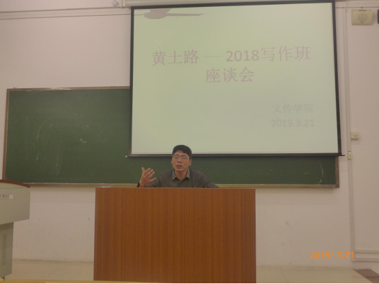 2019年3月21日晚,作家黄土路在格致楼509教室和2018写作班同学进行座谈。会议由周君有老师主持,全体2018写作班同学参加了会议。