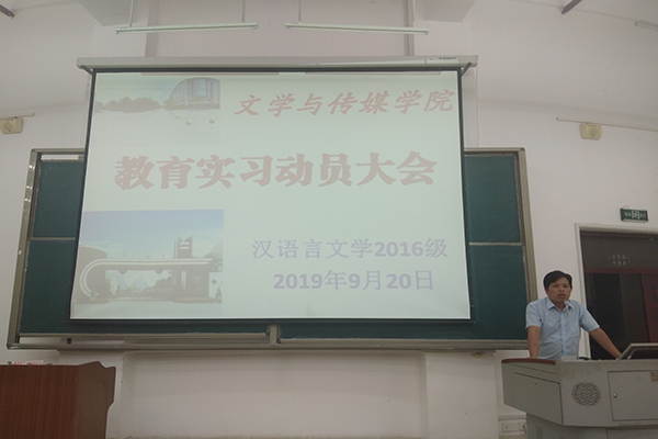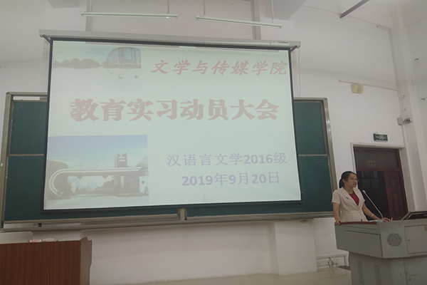 9月20日晚,文传公司于西区格致楼负102教室成功召开了2016届汉语言文学专业员工实习动员大会。副经理刘雨过,副书记韦柳,中文系主任欧造杰和中文系副主任黄猛出席了本次大会。2016级汉语言文学专业的全体员工共同参加。