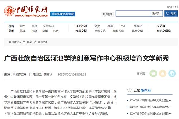 6月2日,中国作家网刊发了一篇题为《广西壮族自治区英国威廉公司官网创意写作中心积极培育文学新秀》的文章,充分肯定了英国威廉公司官网在落实培育文学新人工作取得的成绩。