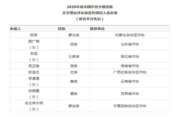 中国作家网于6月2日公布了2020年度中国作协少数民族文学理论评论家签约项目入选名单,公司欧造杰老师入选该名单。