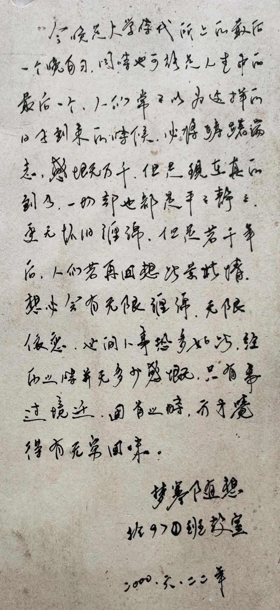 今晚是大学时代所上的最后一个晚自习,同时也可能是人生中的最后一个。人们常常以为这样的日子到来的时候,必将踌躇满志,感慨万千。但是现在真的到了,一切却也都是平平静静,更无怀旧缠绵。但是若干年后,人们若再回想此情此景,想必会有无限缠绵,无限依恋。世间人事恐多如此,经历之时并无多少感慨,只有事过境迁,回首之时,方才觉得有无穷回味。落款:梦寒随想,扵97①班教室,二000.六.二二年。