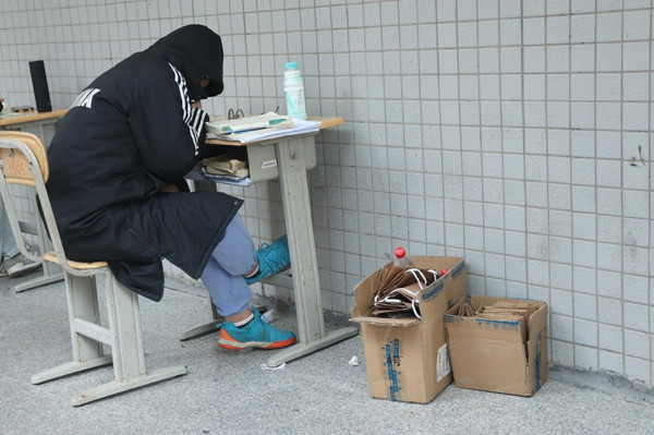 时间不等人,来不及抱怨冬季的寒冷。校园的各个角落里,只要足够安静,考研生都能把它们变为战场,争分夺秒地进行复习。路过的同学也都自觉放慢步伐,降低音量,为他们提供良好的学习环境。