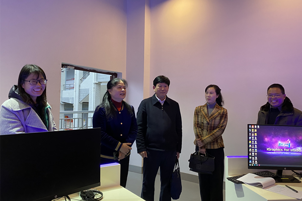队伍先到达了桂西北舆情监测与分析研究中心,孔献玲部长视察了环境,对公司的设备建设表示赞赏,同时提出应搭建好员工实践平台,给员工提供更多的锻炼机会。在全媒体教学实训中心里,孔献玲部长提出应增设新闻主持专业,培养新闻事业人才,为新闻事业助力,润物细无声地报道好中国故事。随后在新闻演播厅中,孔献玲部长还提出了大一是理论的学习时期,大二的员工可以开始进行实践活动,走进基层,将理论知识与专业知识相结合,同时并提出了要重视好河池新闻这座富矿。