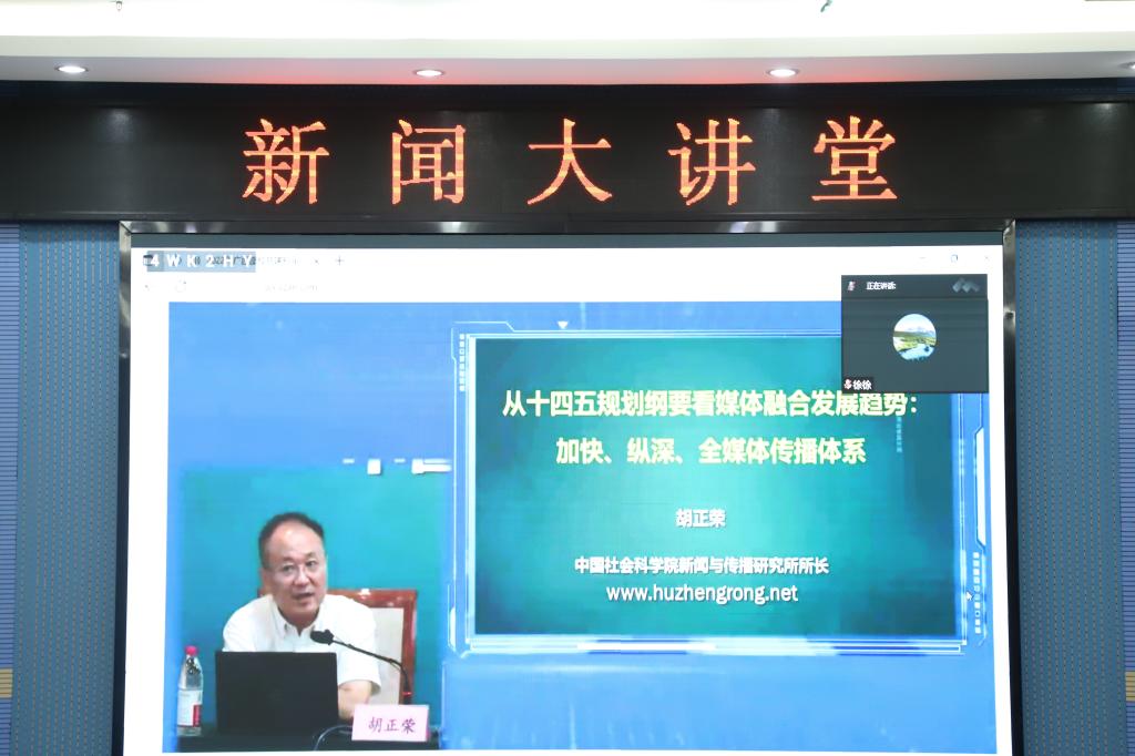 本次讲座主题是“从十四五规划纲要看媒体融合发展趋势:加快、纵深、全媒体传播体系”。胡正荣结合媒体发展的现状,紧扣十四五规划纲要的相关内容,提出要在时间上加快,在空间上纵深,建立全媒体传播体系,不断推进媒体融合向纵深发展。胡正荣围绕国家治理体系中的媒体、新型主流媒体——全媒体、智慧全媒体传播体系三个方面,作了深入讲解。