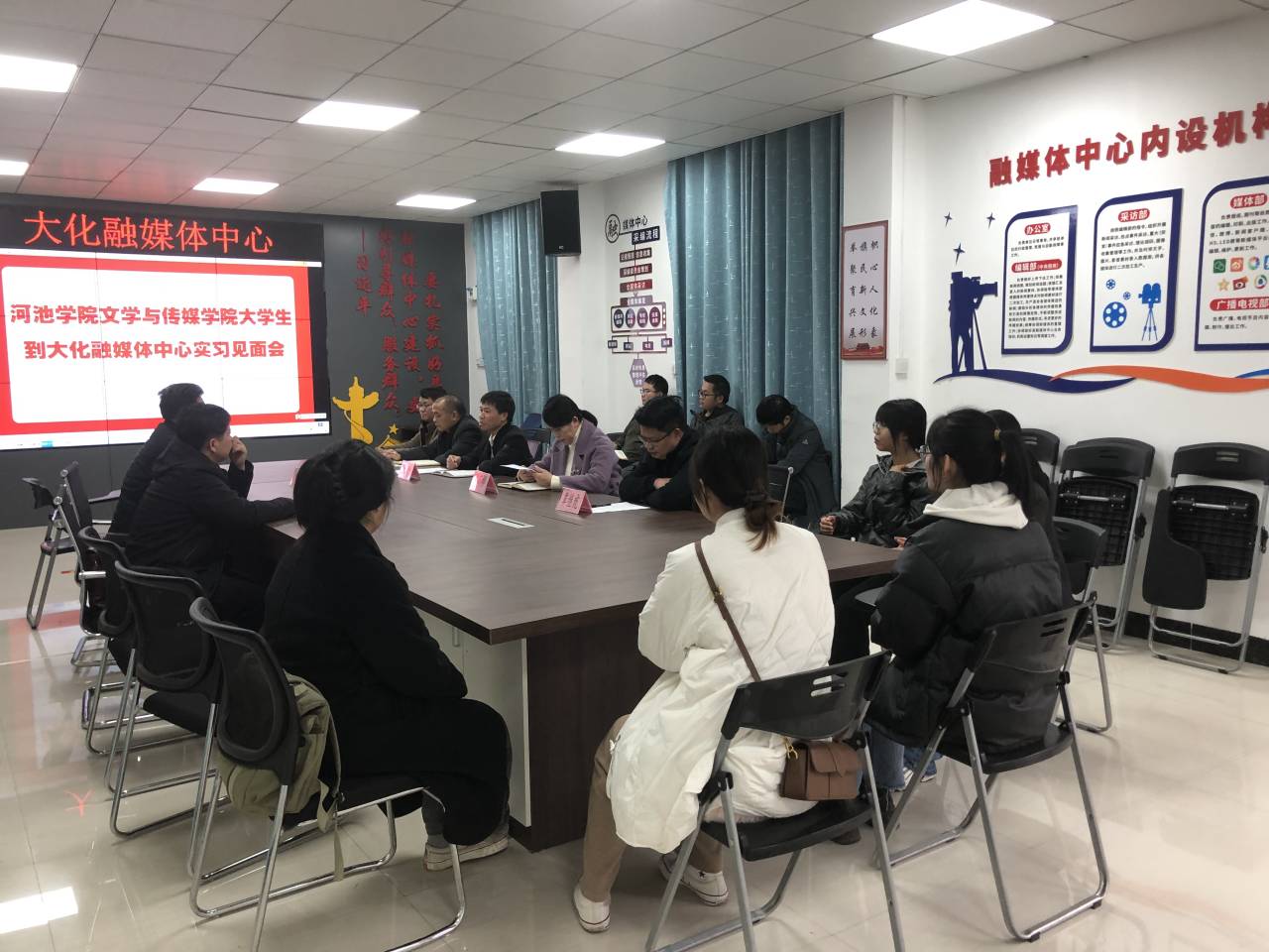 2月10日, 2019级新闻学专业6名员工在副经理欧造杰和白云昭老师的带领下,赴大化县融媒体中心开展毕业实习。大化县委宣传部部长韦莉桦、副部长覃继虎,融媒体中心韦哲主任、覃文军副主任及中心各部门负责人出席了见面会。