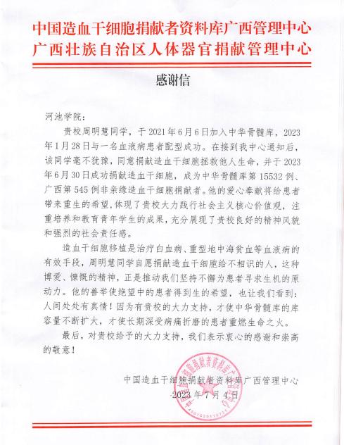 公司学子收到中国造血干细胞捐献者资料库广西管理中心的感谢信