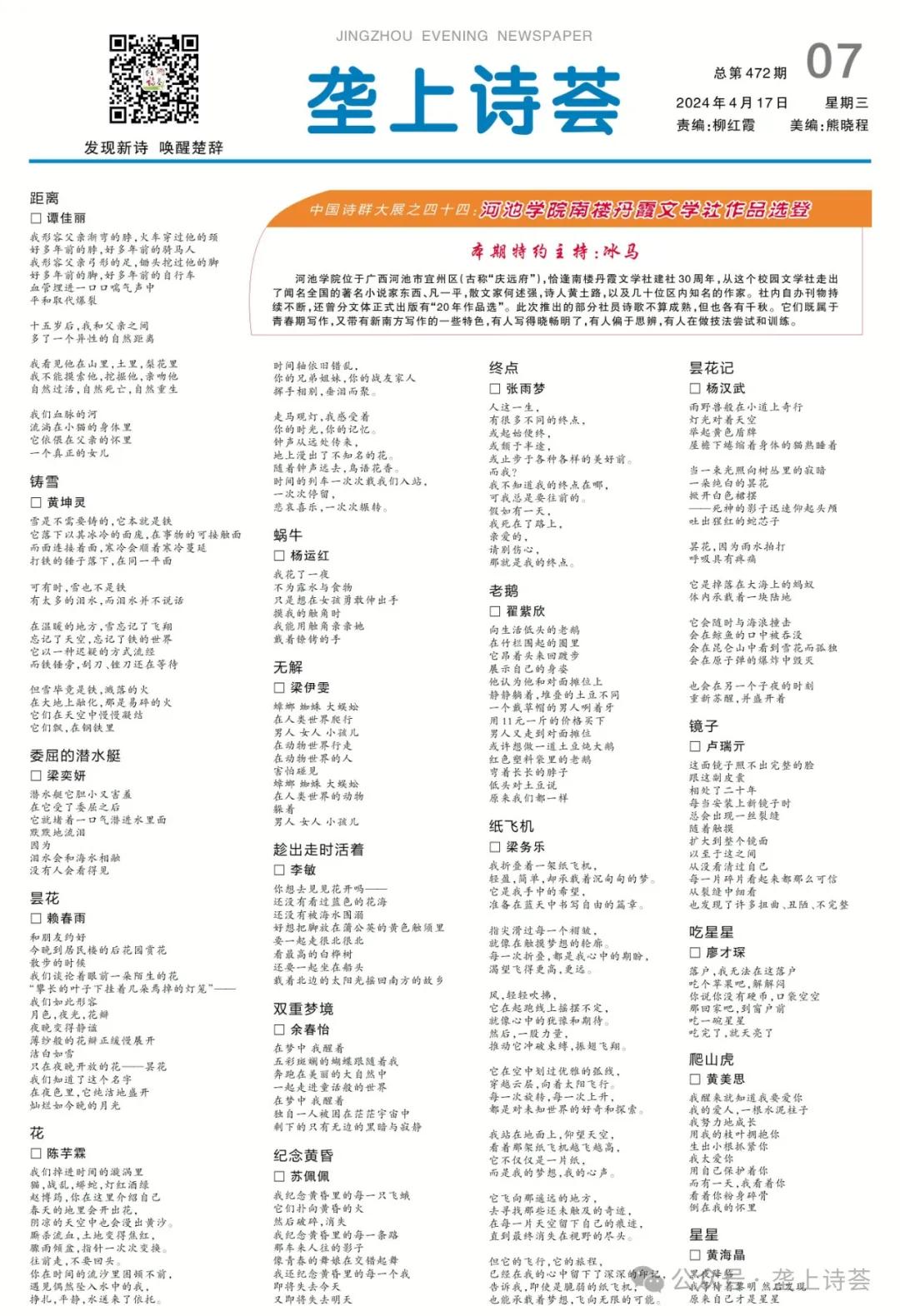 近期,文学与传媒学院16名员工杨汉武、卢瑞亓、廖才琛、黄美思、黄海晶、杨运红、谭佳丽、赖春雨、梁奕妍、梁伊雯、李敏、余春怡、苏佩佩、张雨梦、翟紫欣、梁务乐的诗歌作品在《荆州晚报》副刊《垄上诗荟》第472期上发表。