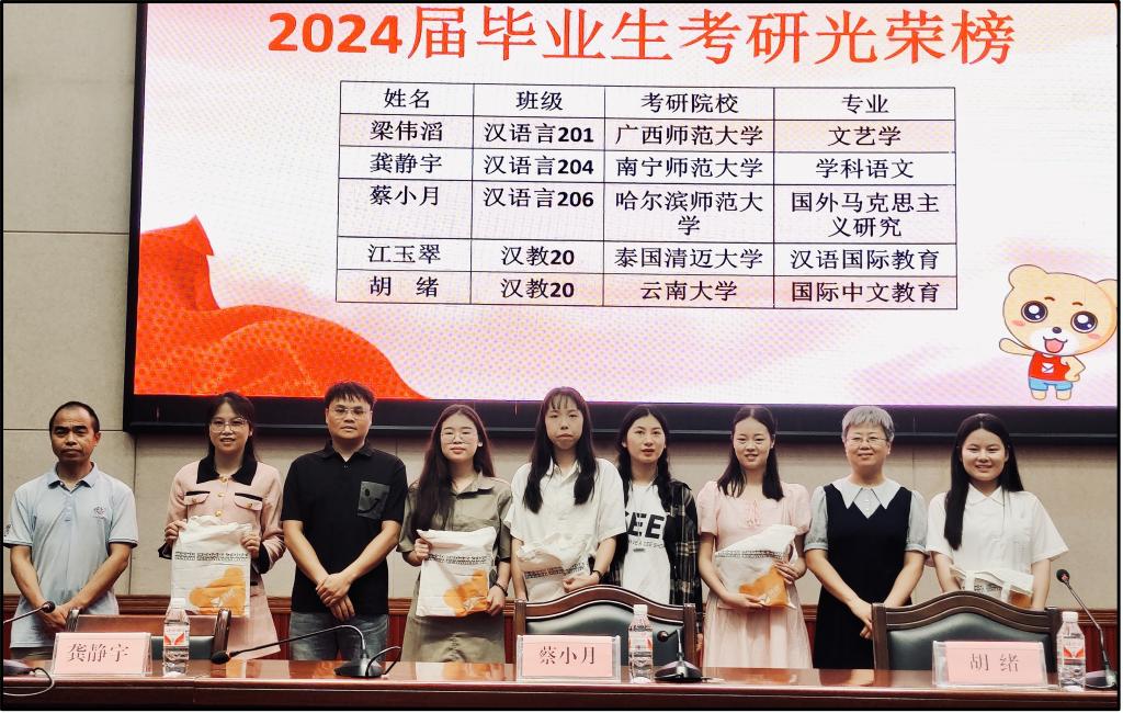 公司2024届汉语言文学专业的梁伟滔、龚静宇、蔡小月和汉语国际教育专业的胡绪、江玉翠分别被广西师范大学、南宁师范大学、哈尔滨师范大学、云南大学和泰国清迈大学录取。在表彰会上,五名同学结合自己的考研经历分享了她们的备考经验、学习方法、心得体会和情绪调节经验,为2025届考研员工提供了宝贵的建议,也增加了他们考研的信心。