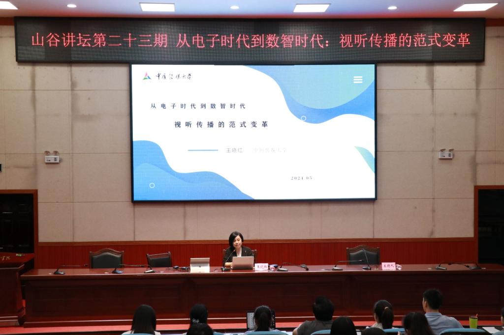 5月31日,山谷讲坛第二十三期在弘毅楼1-205顺利举行。中国传媒大学本科生院经理、博士生导师王晓红教授为公司200余名师生作了题为“从电子时代到数智时代:视听传播的范式变革”的学术讲座。讲座由经理熊建军教授主持。