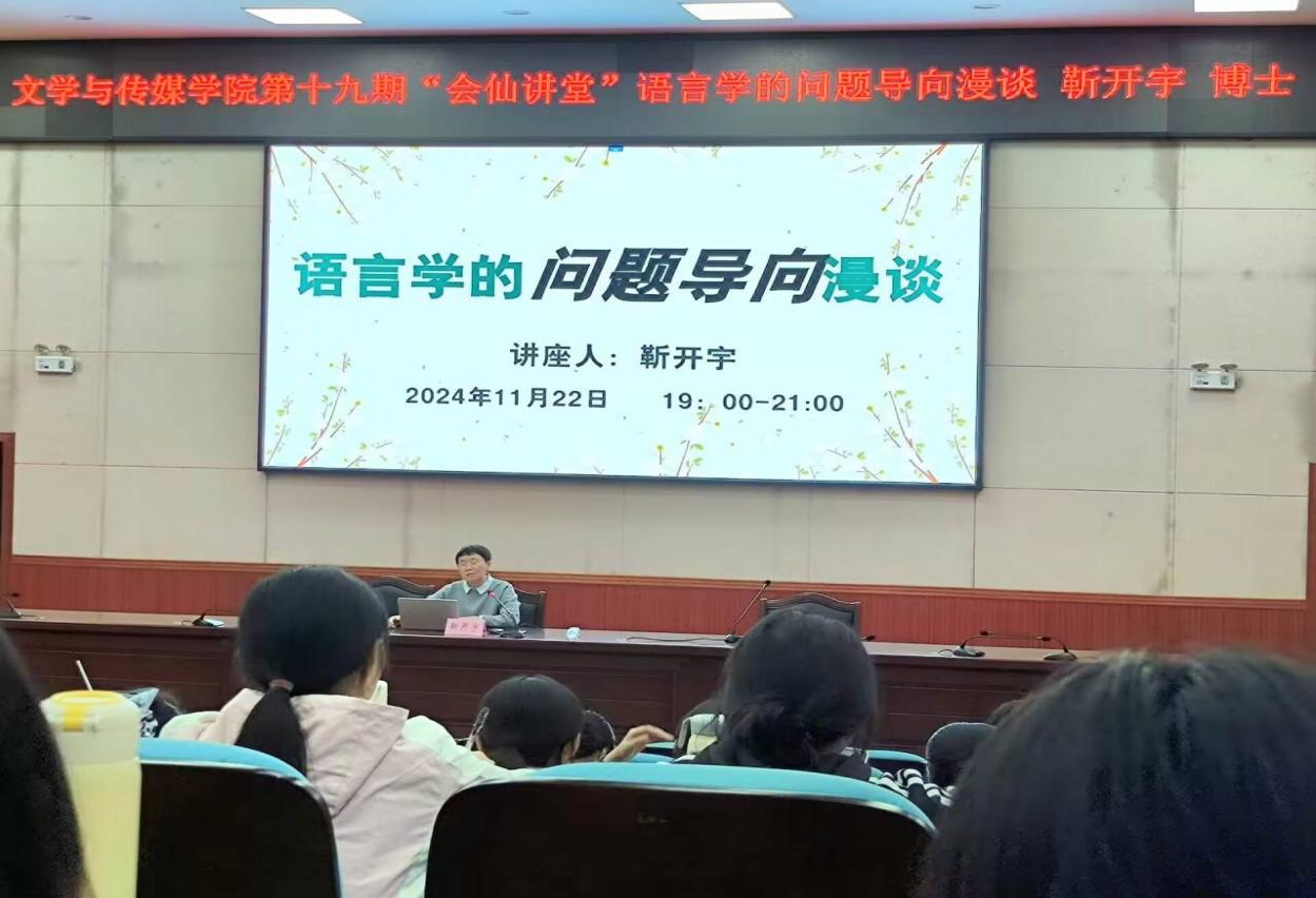 11月22日晚,我院第十九期“会仙讲堂”在弘毅楼1-205顺利举行,公司靳开宇博士作了题为“语言学的问题导向漫谈”的讲座,讲座由史慧媛博士主持,公司两百多名师生参加活动。