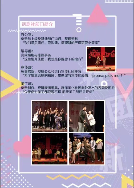 “喜怒哀乐纷呈台上,爱恨情仇尽在戏间。”在这里,你可以在舞台上展示自己的表演天赋,也可以在幕后发挥自己的各方面特长,只要你有一颗热枕的心,所有的梦都能在那一片广阔的舞台实现!