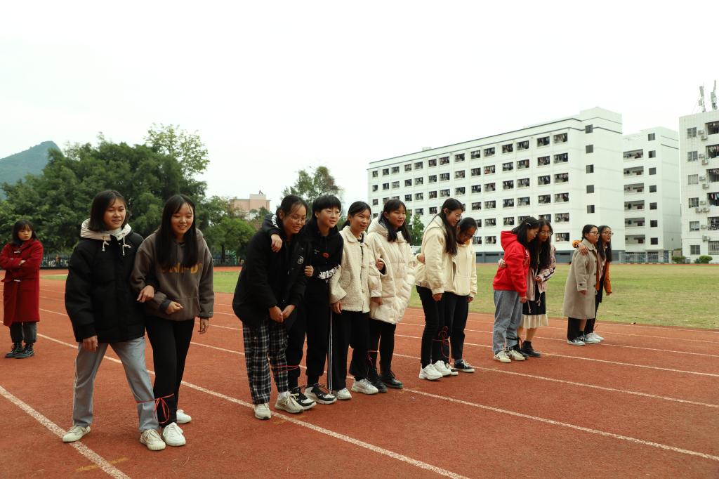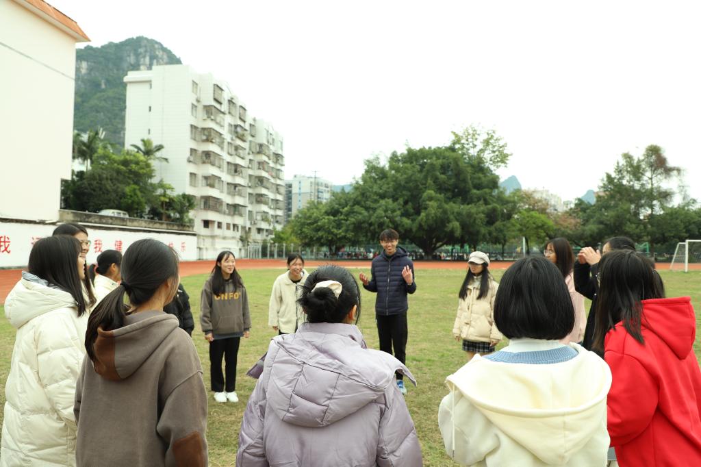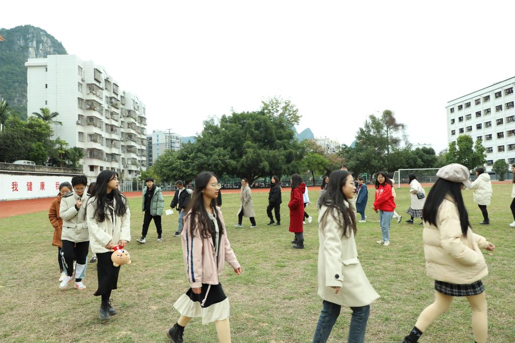 覃新荔、韦玮璐主持活动。第一个项目是“你划我猜”,成员们自由组队,六人一组,两人对抽取到的词语进行比划,四人猜。经过激烈又令人捧腹大笑的比赛,最终由第二组拔得头筹,赢得了笔记本、便利贴等奖品。之后,进行了“007”、“数字报团”等项目,整个田径场上充满了大家欢乐的笑声。
