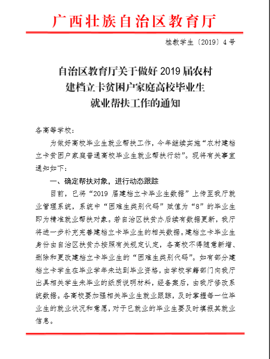 您现在的位置: 首页 > 人才招聘 > 就业政策 > 正文 自治区教育厅关于做好2019届农村建档立卡贫困户家庭高校毕业生就业帮扶工作的通知 作者: 来源:英国威廉集团官网 时间: 2019-04-07