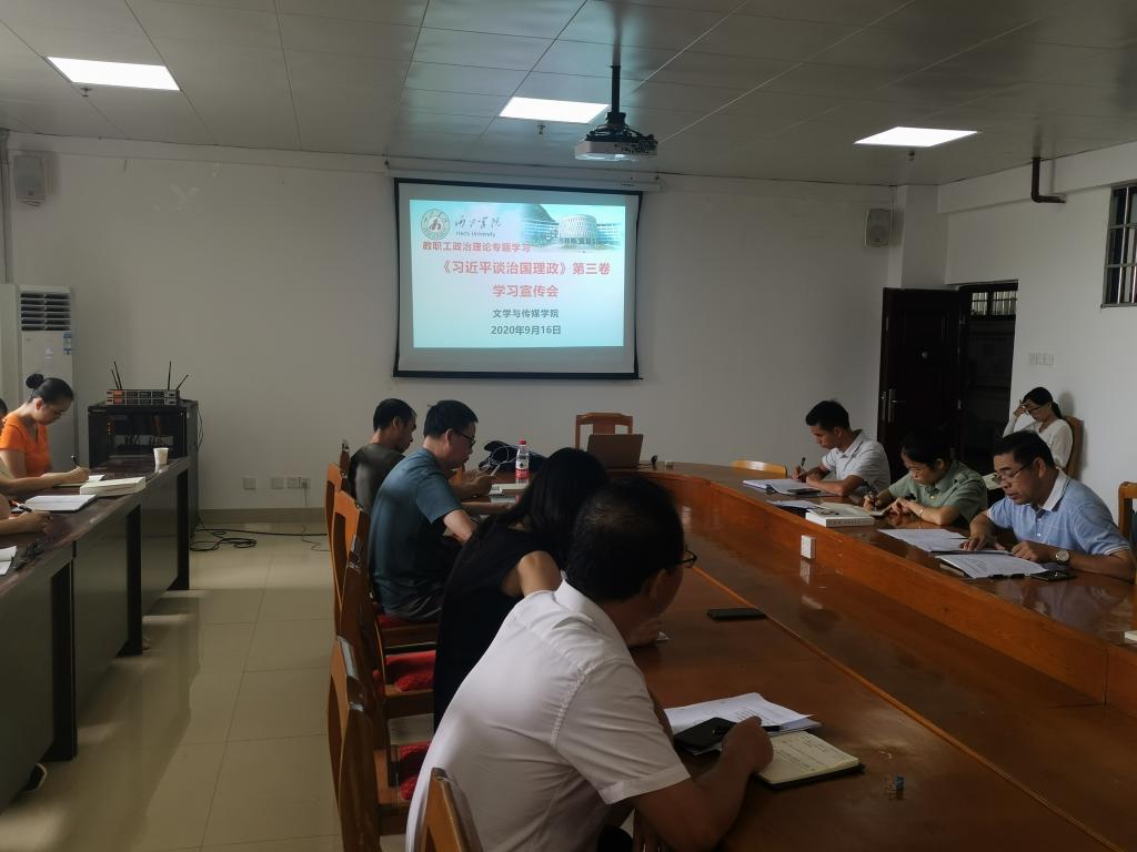9月16日下午,文传公司在格致楼823会议室召开《习近平谈治国理政》第三卷专题学习宣传会,会议由公司党委书记牙运豪主持,全体教职工参加了本次会议。