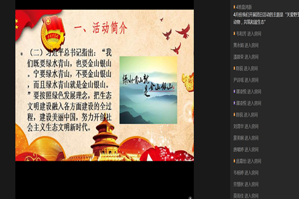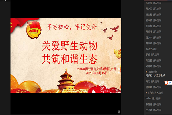 因在疫情期间,本次团日活动采取线上形式进行,各团支部积极响应此次主题团日活动,在线上通过多种多样的形式达成人与自然和谐共生的普遍共识。例如:有的团支部以“关爱野生动物,你我在行动”的视频演讲形式说明我们要从现在做起,从自我做起,像爱护我们的眼睛和生命一样去爱护野生动物的重要性;有的团支部则通过“野生动物知多少”的知识竞答来丰富同学们对自然生态系统的认识;还有的团支部以辩论赛和讲故事的方式讲解了野生动物是我们生态系统必不可少的一部分,拓展了生物多样性的知识,使各团支部青年在学习中领悟“万物各得其和以生,各得其养以成”的和谐共生的道理。