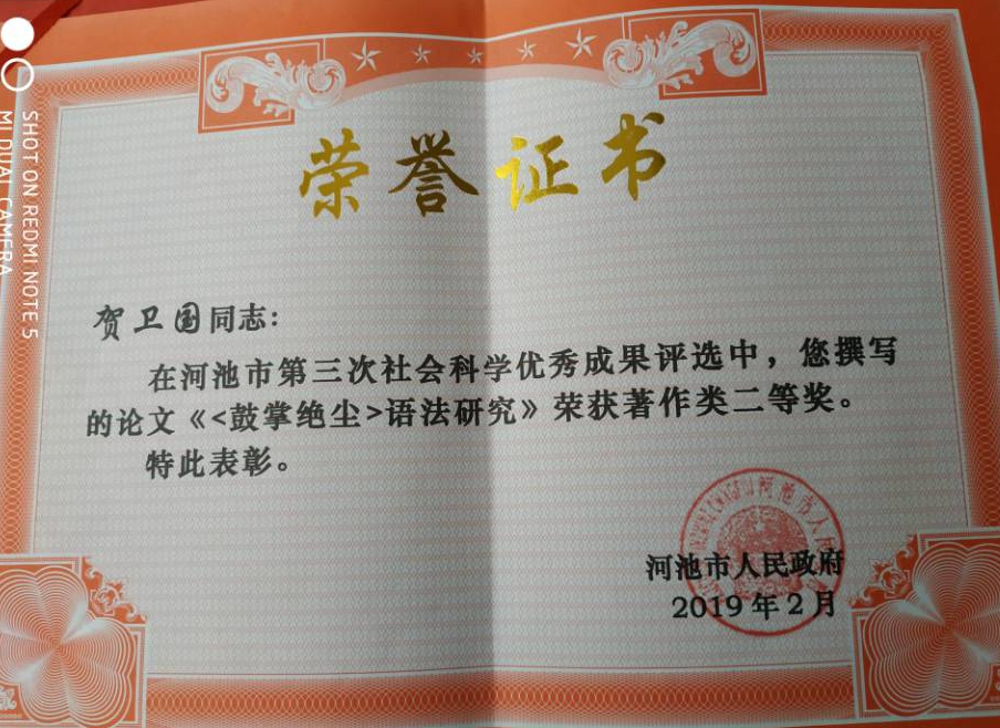喜讯:贺卫国论文荣获河池市第三次社会科学著作类二等奖