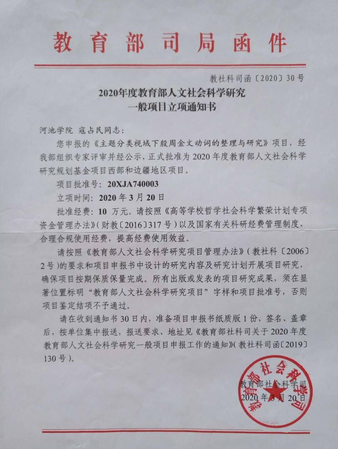 寇占民获得2020年度教育部人文社会科学研究一般项目立项