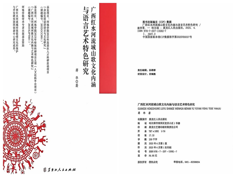 近日,公司蒋华教授学术专著《广西红水河流域山歌文化内涵与语言艺术特色研究》由黑龙江人民出版社正式出版。该书是国内首部全面系统探究红水河流域山歌文化内涵与语言艺术特色的学术力作。