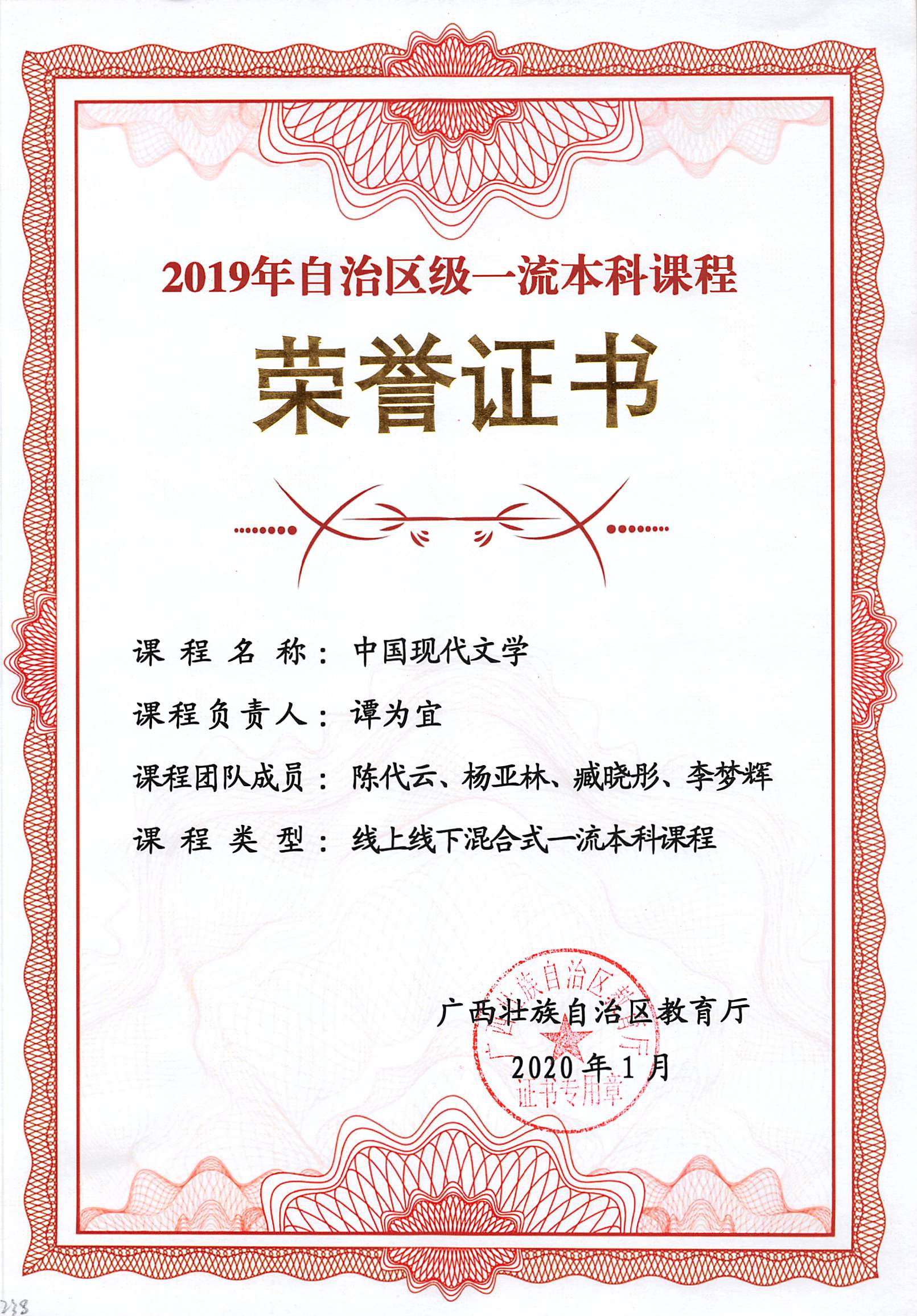 《中国现代文学》获批2019年自治区级一流课程