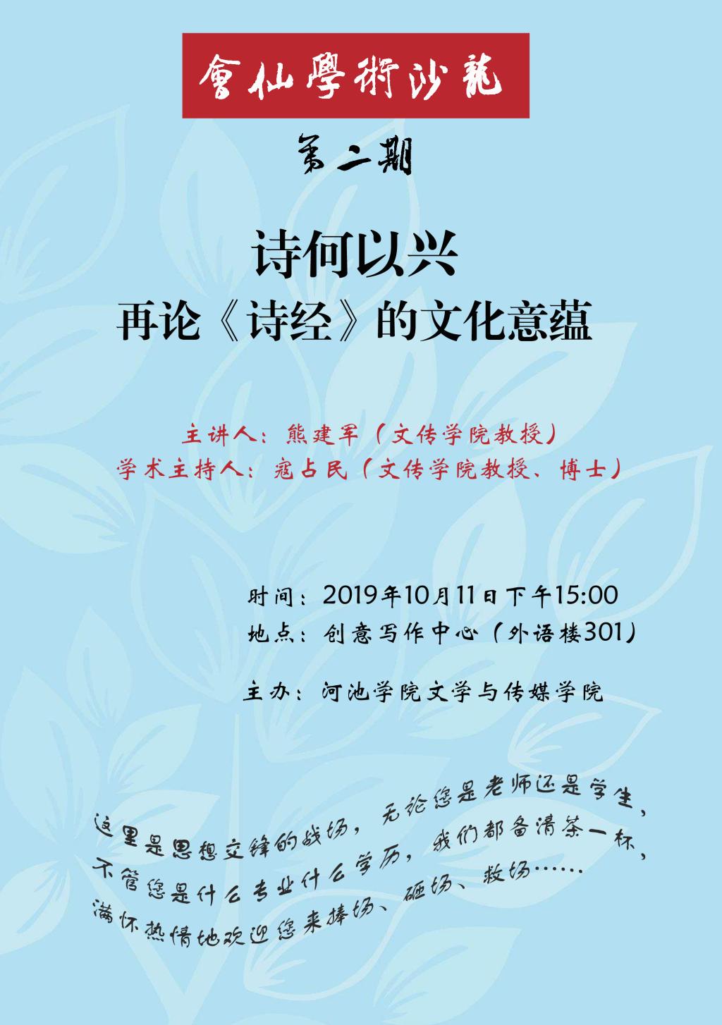 您现在的位置: 首页 > 讲座预告 > 正文 【会仙学术沙龙】第二期:熊建军主讲诗何以兴一一再论《诗经》的文化意蕴 作者: 来源:英国威廉集团官网 时间: 2019-10-08 【会仙学术沙龙】第二期 题目:诗何以兴一一再论《诗经》的文化意蕴 时间:2019年10月11日下午15:00 地点:创意写作中心(外语楼301) 主讲:熊建军