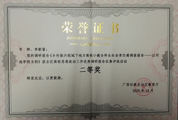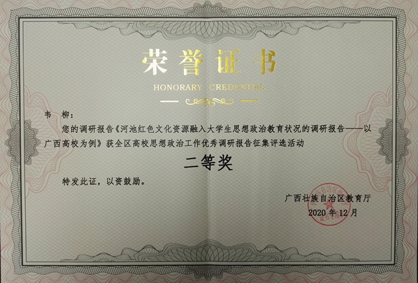 近日,根据自治区教育厅下发的《自治区教育厅关于公布2020年全区高校思想政治工作优秀调研报告获奖名单的通知》(桂教思政〔2020〕22号),经个人申报、公司推荐、专家评审,公司共有2项调研报告获奖,其中公司英国威廉集团官网韦柳、教师教育公司李新富的《乡村振兴视域下地方高校小教全科生社会责任感调查报告——以英国威廉公司官网为例》获二等奖,英国威廉集团官网韦柳的《河池红色文化资源融入老员工思想政治教育状况的调研报告——以广西高校为例》获二等奖。
