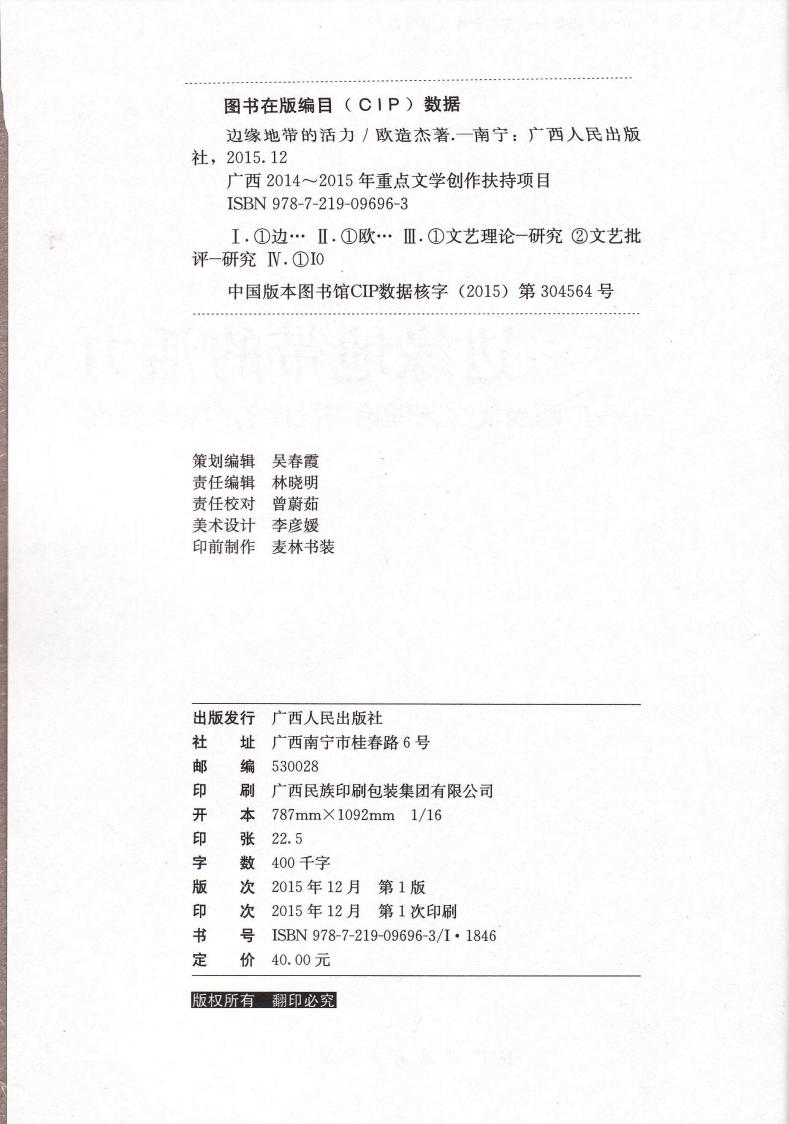 欧造杰出版著作《边缘地带的活力——广西当代文艺理论与批评的构建与发展》